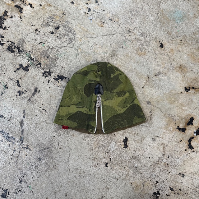 90s OAKLEY LAYERED CAMO ZIP BEANIE COLOR : GREEN / KHAKI CONDITION : NORMAL MATERIAL : ACRYLIC 50% , LANA WOOL 50% SIZE : ONE SIZE