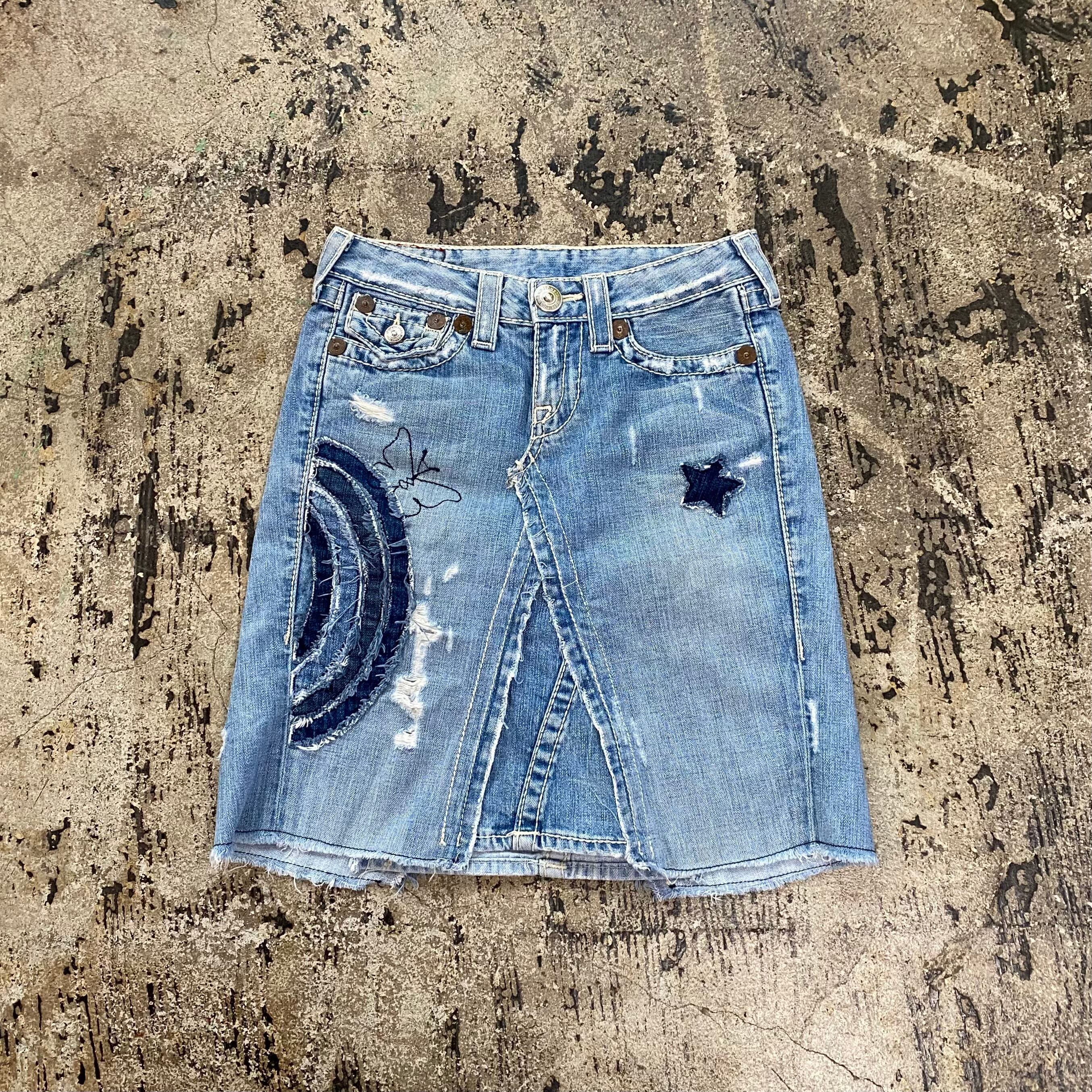 TRUE RELIGION REPAIRED PATCH DENIM SKIRT